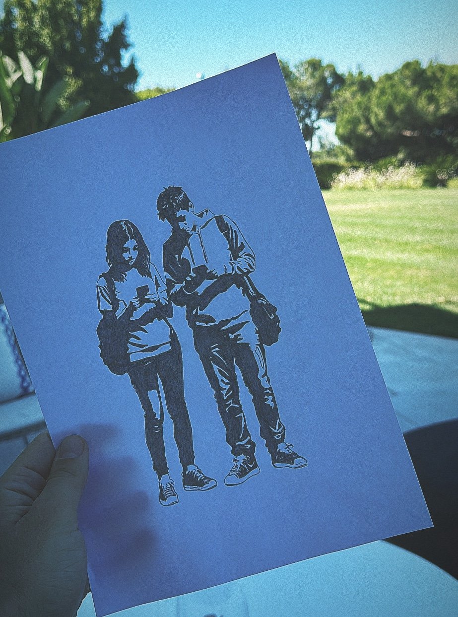 I approached the drawing with deliberate simplicity: blocks of ink, clean negative space, and the precise balance between what I reveal and what I withhold. The figures emerge from sharp contrasts, “lights and shadows” both in the technical and metaphorical sense. The illuminated passages, like the glint on a cheek or the white edge of a sneaker, coexist with fields of black that seem to absorb them. The play of contrast is not only formal; it describes the very condition I wanted to capture, the duality of adolescence under the light of the screen. Technology promises illumination, but in its glow, I often see a shadow: of anxiety, distraction and loss of presence.